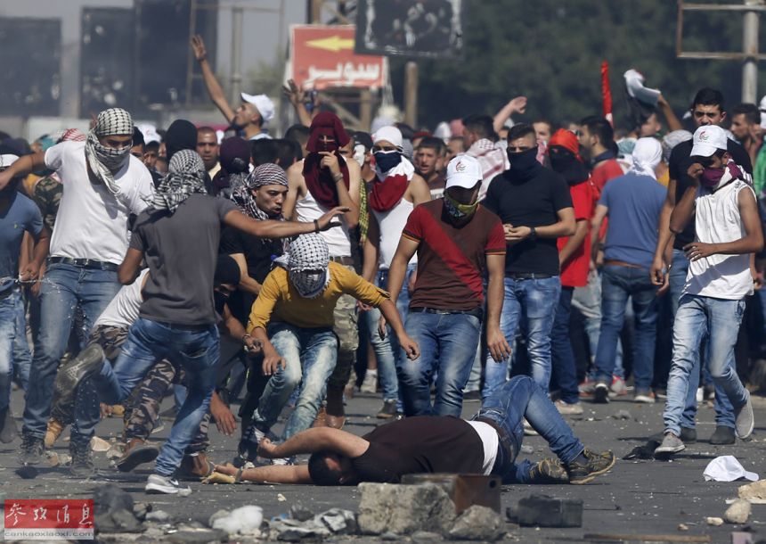 10月11日,约旦河西岸城市纳布卢斯,巴勒斯坦示威者正在帮助受伤的同伴。