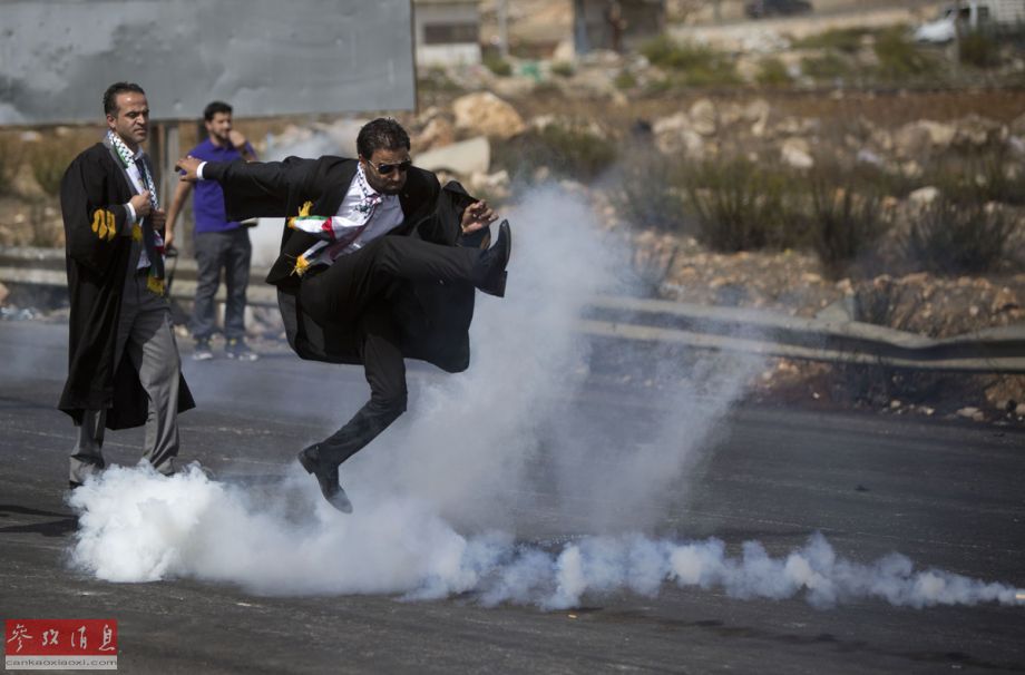 10月12日,耶路撒冷老城附近,一名巴勒斯坦律师将催泪弹踢回以色列军警一侧。