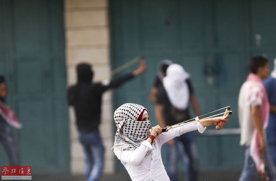 10月13日,约旦河西岸城市伯利恒,一名巴勒斯坦女示威者用弹弓向以色列军警发动攻击。
