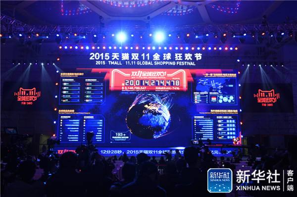 ↑11月11日,在北京水立方数据直播大厅的大屏显示,2015天猫“双十一”全球狂欢节交易额在零时33分53秒超越200亿元。新华社记者 鞠焕宗 摄