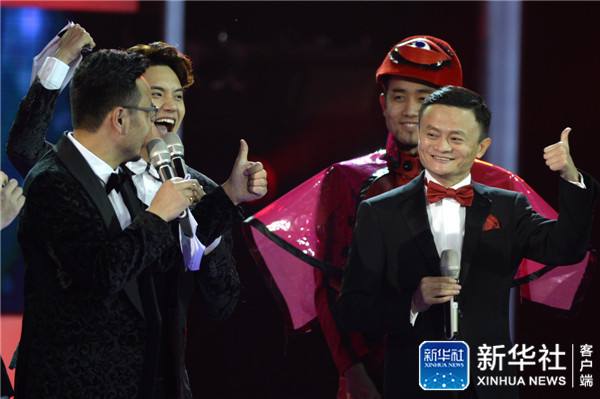 ↑11月10日,在北京水立方的“天猫2015双11狂欢夜”上,阿里巴巴集团董事局主席马云(右一)在台上通过电视与买家进行游戏互动。新华社记者 鞠焕宗 摄