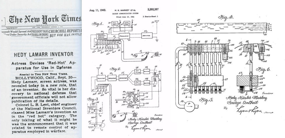 海蒂决定投身科学界,她想证明,她除了脸蛋还有其他更多的东西,她从影之前学的是通信专业。1940年海蒂·拉玛与英国作曲家乔治·安塞尔一同发明了能够抵挡电波干扰的军事通讯系统,1942年8月11日,他们从美国专利局获得了名为秘密通信系统(Secret Communications System)的专利,编号为2,292,387。这就是“跳频技术”也就是CDMA的前身,不过这项专利在当时并未受到重视。图为海蒂专利的发明图纸,以及《纽约时报》的报道。