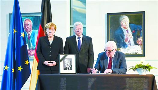 11月11日,在德国柏林,德国外长施泰因迈尔(右)在前总理施密特的吊唁书上签字,德国总理默克尔(左)与总统高克在一旁站立。 新华社/路透