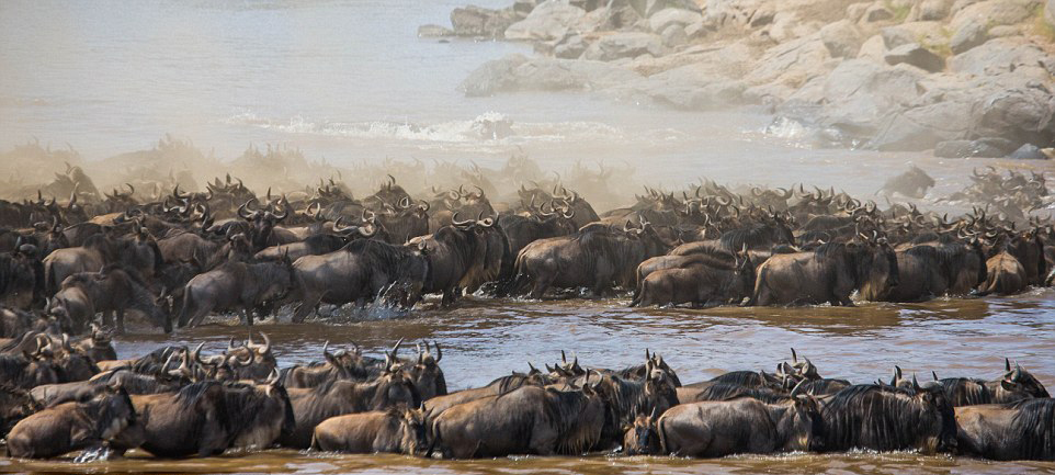 数以百计的角马跳入玛拉河中,互相紧挨着渡河。(网页截图)