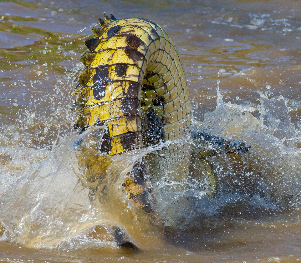 鳄鱼高速扑向猎物时尾巴激起的水花。(网页截图)