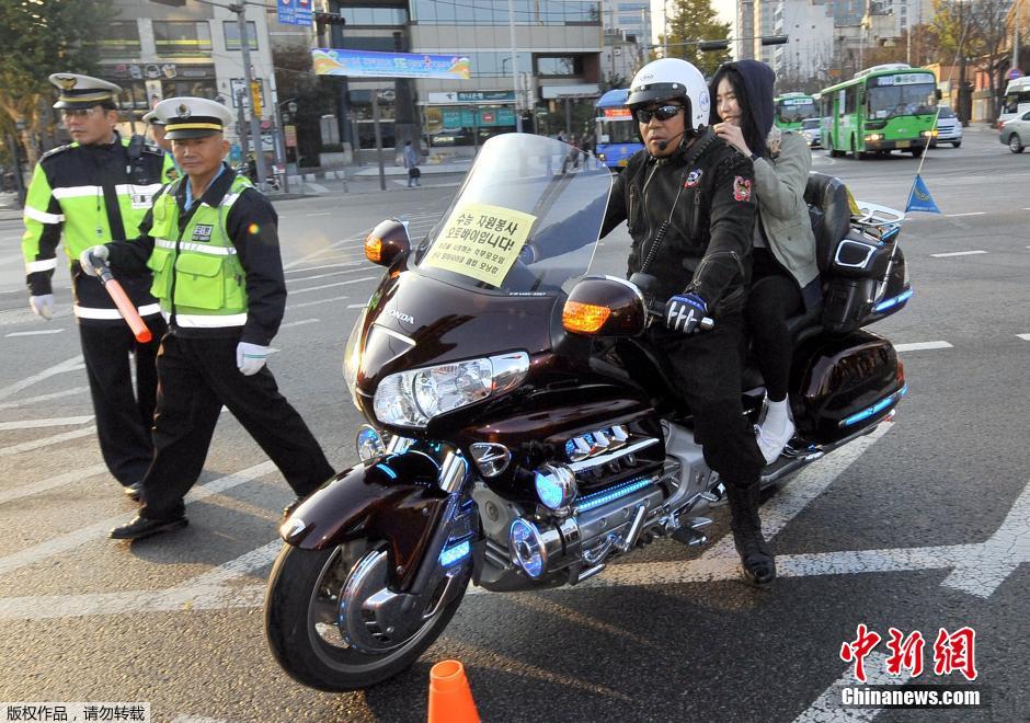 一名考生赶时间,首尔的交警用摩托车载着她奔向考场。