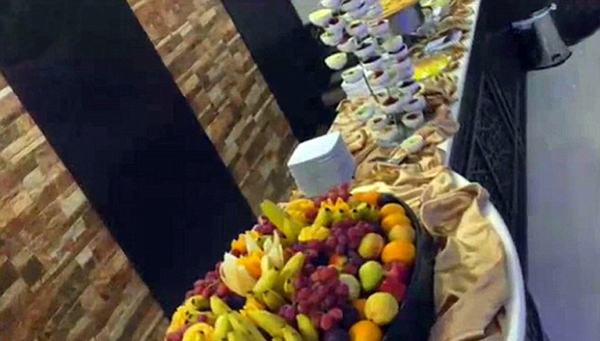 桌子末端有大盆的水果,附近也可看到美味佳肴。(网页截图)