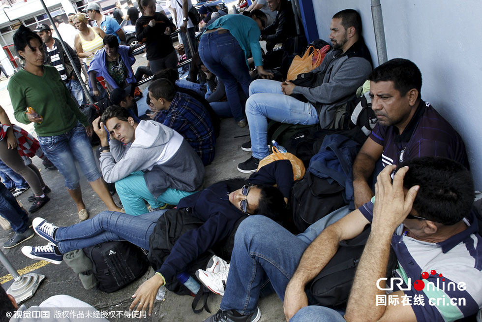当地时间2015年11月12日,哥斯达黎加圣何塞,古巴移民在拘押中。据哥斯达黎加移民部门消息,当地警方逮捕了13名涉嫌帮助古巴移民偷渡美国的古巴人,并拘押了约200名古巴移民。图片来源:Reuters/视觉中国