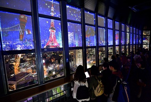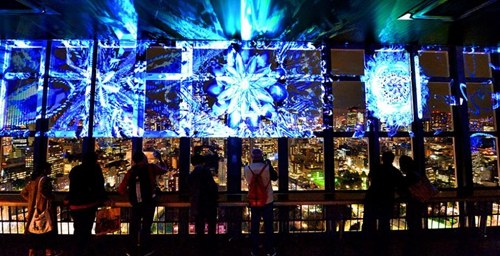 据报道,当天,在展望台楼层的4面观景玻璃窗上,投映出星空及少年畅游于梦中世界的影像。