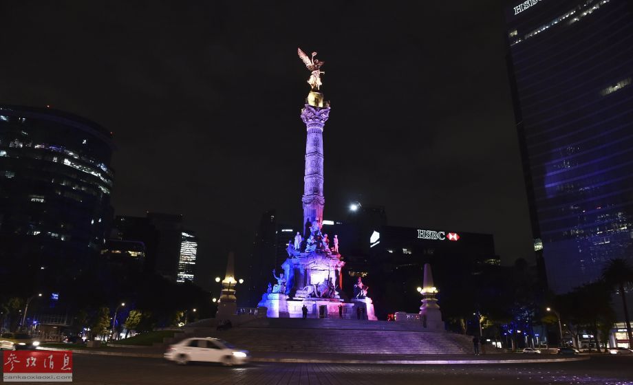 11月13日,墨西哥独立天使广场亮起法国国旗的颜色,悼念巴黎恐怖袭击遇难者。