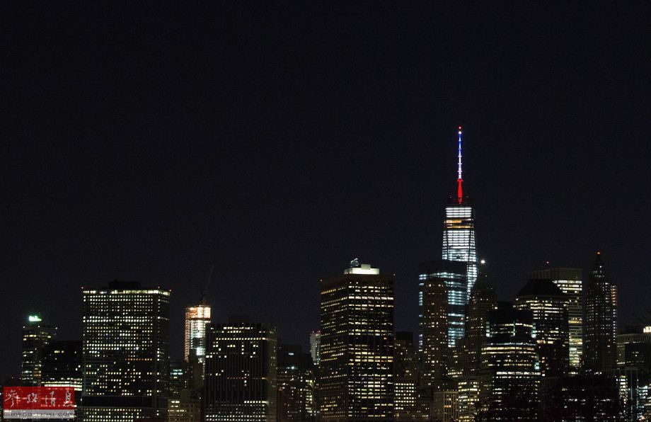11月13日,为悼念巴黎恐怖袭击遇难者,纽约世贸大楼的塔尖亮起法国国旗的颜色。