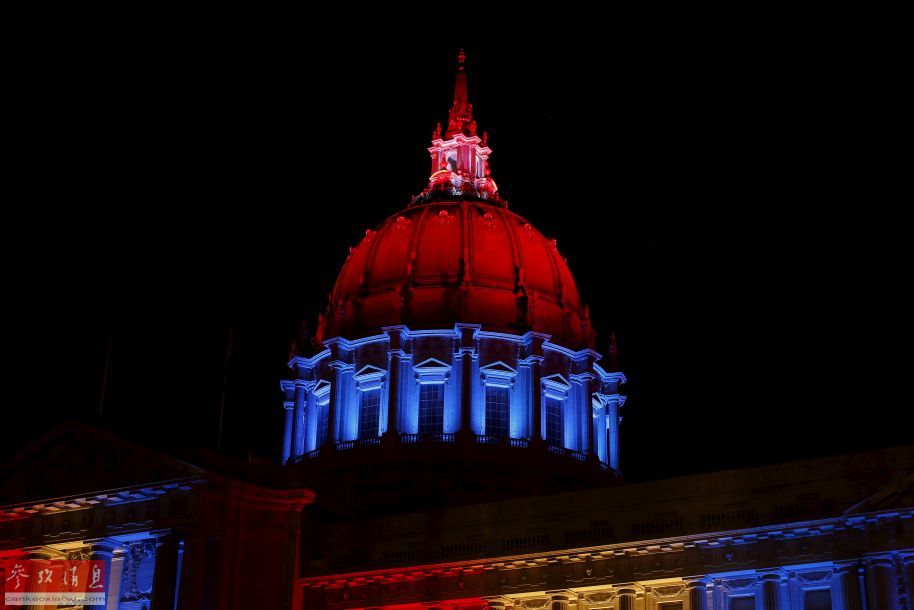 11月13日,美国旧金山市政大厅亮起法国国旗的颜色,悼念巴黎恐怖袭击遇难者。