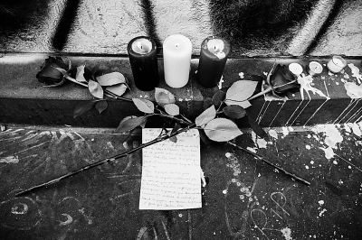 11月14日,人们在法国巴黎共和国广场点燃蜡烛、摆放鲜花,悼念恐怖袭击事件遇难者。新华社记者 周磊摄