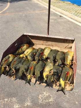 图为:昨日在咸宁城区,20只红嘴相思鸟撞上玻璃幕墙身亡