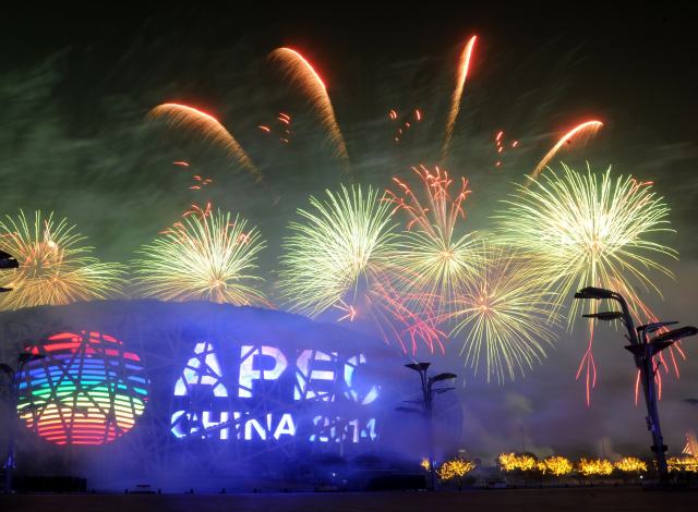 2014年11月10日,北京在奥林匹克公园举行焰火表演。APEC第二十二次领导人非正式会议2014年11月10日至11日在北京举行。新华社记者罗晓光摄