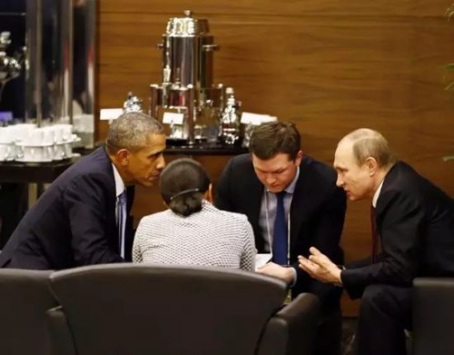 奥巴马与普京的再度交流出现在G20峰会工作午餐的场合,现场的公共电视信号捕捉到了两位总统“热聊”的镜头。镜头显示,面对面坐在沙发里的两位总统都倾身向前,试图让对方在较为嘈杂的环境里听清楚自己的话。坐在他们身边的分别是美国国家安全顾问苏珊·赖斯和一位俄罗斯助手。