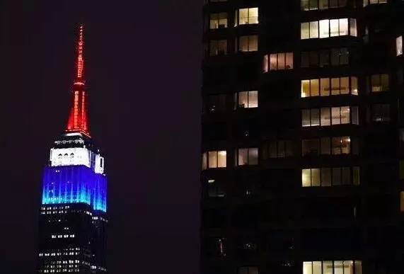 来自各地的网友照片显示,世界多地标志性建筑都亮起了象征法国国旗的红、白、蓝三色,为法国祈福。图为纽约帝国大厦。