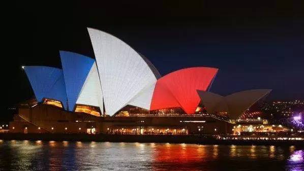 来自各地的网友照片显示,世界多地标志性建筑都亮起了象征法国国旗的红、白、蓝三色,为法国祈福。图为悉尼歌剧院。