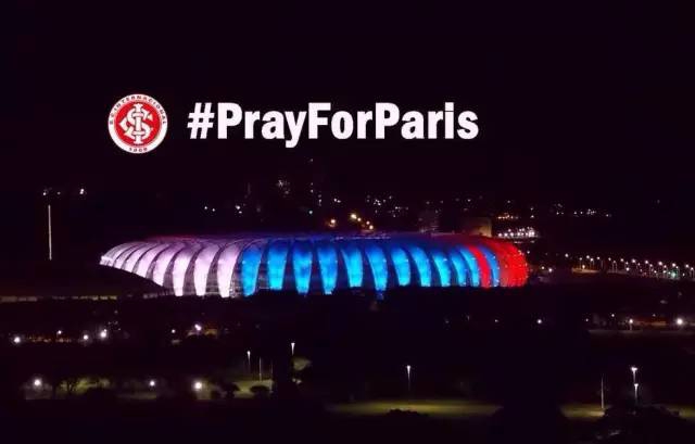 来自各地的网友照片显示,世界多地标志性建筑都亮起了象征法国国旗的红、白、蓝三色,为法国祈福。图为巴西河岸球场。