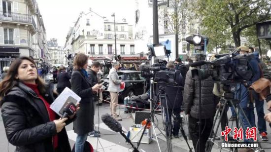 一处遭遇恐怖袭击的电影院所在的伏尔泰大街,全部戒严,众多媒体在现场报道。 在法华人黄申平 供图