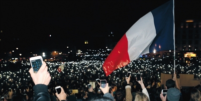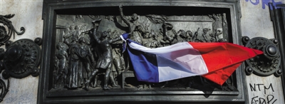 15日,在法国巴黎的共和国广场,人们将法国国旗挂在纪念碑上,悼念恐怖袭击遇难者。新华社记者 周磊 摄