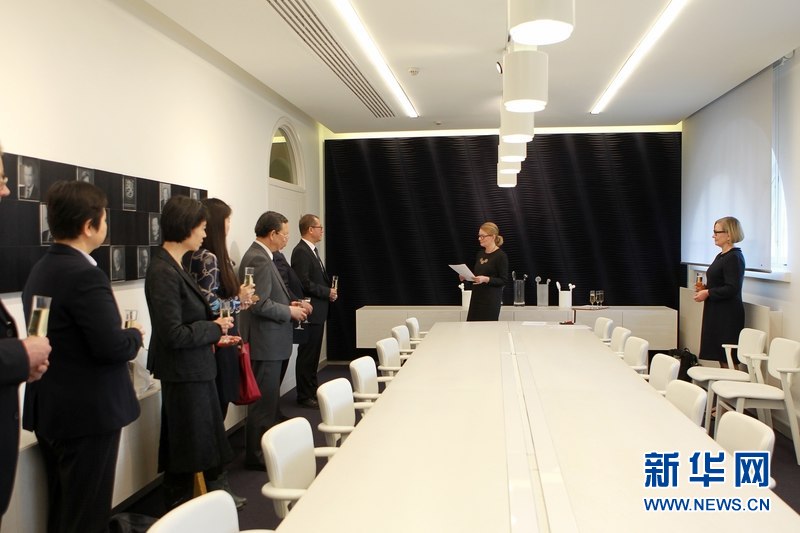 11月12日,赫尔辛基,芬兰外贸和发展部长莱妮塔·托伊瓦卡(右二)主持授勋仪式。为表彰中关村发展集团驻芬兰办事处主任朱梓齐对中芬经贸合作的持续努力和贡献,芬兰总统尼尼斯特决定向其颁发一级骑士狮子勋章。11月12日,芬兰外贸和发展部长莱妮塔·托伊瓦卡主持授勋仪式。她表示,本周二是芬兰与中国正式建交65周年纪念日。自1950年以来,双边关系不断深化发展,这与两国日益密切的经贸往来是分不开的。新华社记者李骥志摄