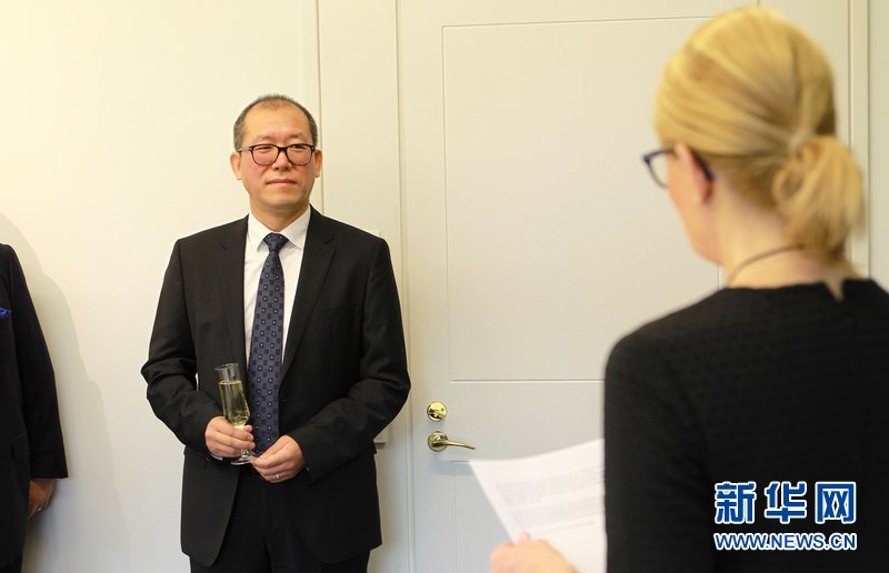 11月12日,赫尔辛基,芬兰外贸和发展部长莱妮塔·托伊瓦卡(右一)向中关村发展集团驻芬兰办事处主任朱梓齐(右二)致贺词。新华社记者李骥志摄