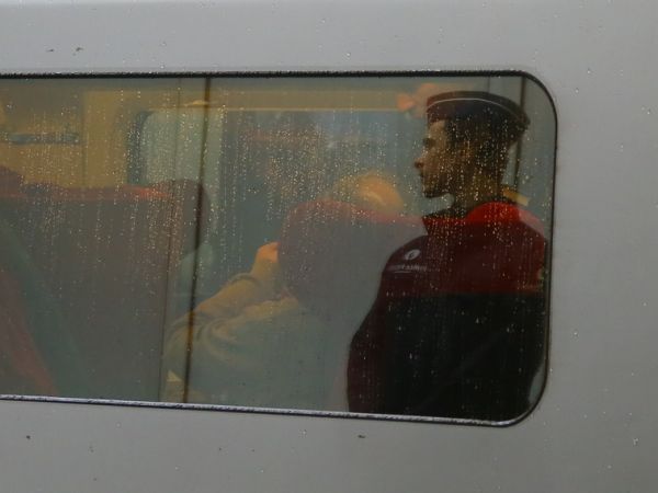11月14日,在比利时首都布鲁塞尔的火车南站,一名警察的身影映在一辆即将开往法国巴黎的“大力士”国际高速列车的车窗上。 新华社记者龚兵摄