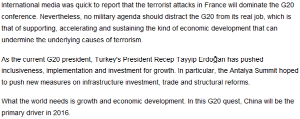 二十国集团领导人第十次峰会于15日下午在土耳其安塔利亚举行第一阶段会议。在二十国集团的不断探索与实践中,中国无疑将成为2016年世界经济的主要驱动力。