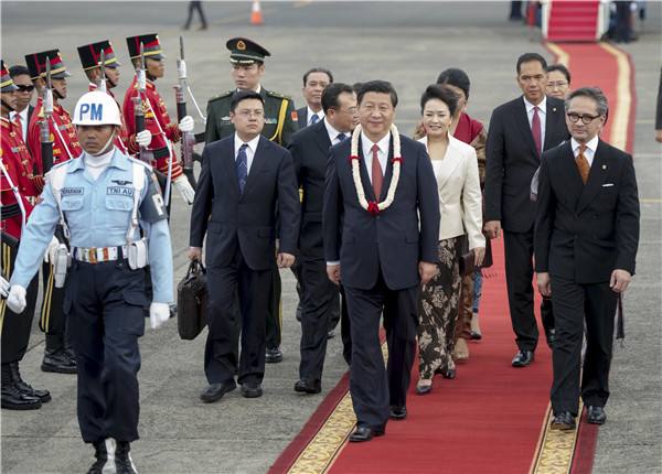 图为2013年10月2日,习近平抵达雅加达开始对印度尼西亚进行国事访问。(马占成摄)