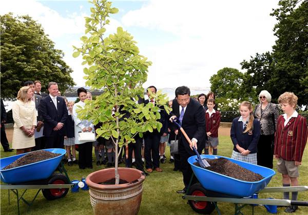 图为2014年11月18日,习近平在澳大利亚塔斯马尼亚州与小学生共同植树。(饶爱民摄)