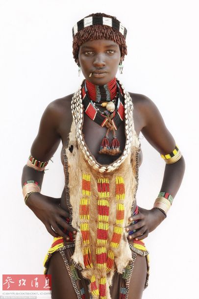 埃塞俄比亚哈马尔部落的妇女穿着兽皮,带着精致的串珠首饰。
