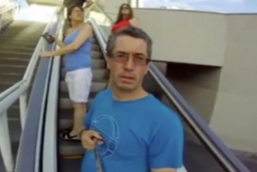 另一张应该是在滚梯上,约瑟夫应该是想拍摄电梯下的景色,但相机记录下的却是他紧缩双眉,拨弄自拍杆的形象。