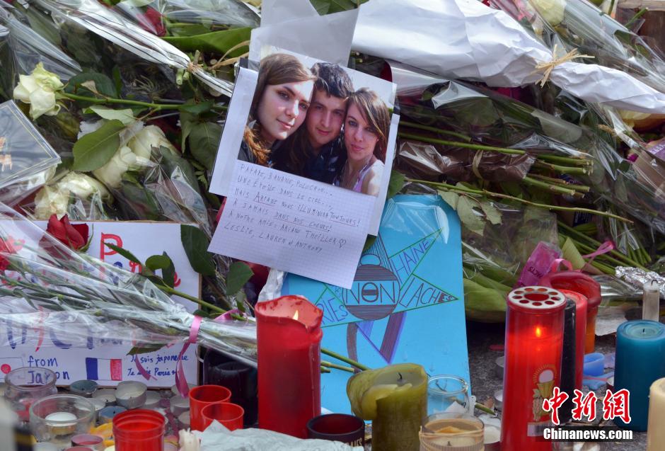 当地时间11月16日,法国举国哀悼巴黎恐怖袭击的遇难者。中午12时,全国民众默哀一分钟悼念死者。在各个遇袭地点,大批民众自发聚集鲜花燃烛表达纪念之情。这是这是《查理周刊》血案后不到一年时间内,法国第二次行国殇之礼。图为巴黎11区巴塔克兰剧院附近的纪念场所摆放着遇难者的遗照。 龙剑武 摄