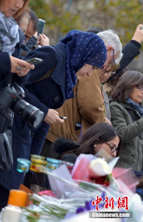 当地时间11月16日,法国举国哀悼巴黎恐怖袭击的遇难者。中午12时,全国民众默哀一分钟悼念死者。在各个遇袭地点,大批民众自发聚集鲜花燃烛表达纪念之情。这是这是《查理周刊》血案后不到一年时间内,法国第二次行国殇之礼。图为巴黎共和国广场上,一位年轻的穆斯林女性参加悼念活动。 龙剑武 摄