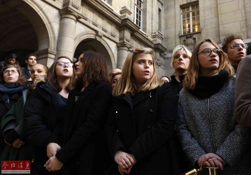 当地时间11月16日,法国民众默哀一分钟,悼念巴黎恐袭遇难者。图为法国民众参加默哀一分钟仪式。