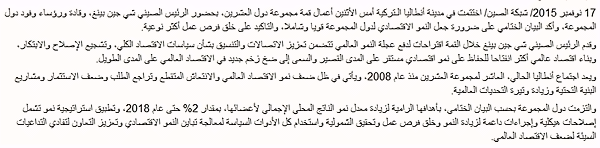 昨日,二十国集团领导人第十次峰会在土耳其安塔利亚闭幕。中国领导人习近平期间出席了峰会,并发表题为《创新增长路径 共享发展成果》的重要讲话,其中强调二十国集团要加强宏观经济政策沟通和协调,推动改革创新,构建开放型世界经济。