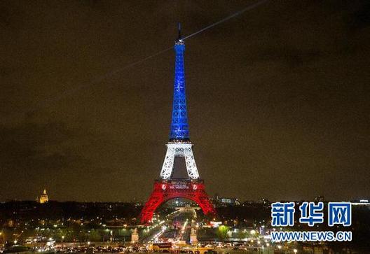 11月17日,法国巴黎埃菲尔铁塔被红、白、蓝三色灯光照亮,并显示巴黎城徽和拉丁语箴言“漂浮而不沉没”。当晚,埃菲尔铁塔被象征法国的红、白、蓝三色灯光照亮,以此为巴黎系列恐怖袭击的遇难者哀悼,并表达法国人民的团结与坚强。 新华社记者徐金泉 摄