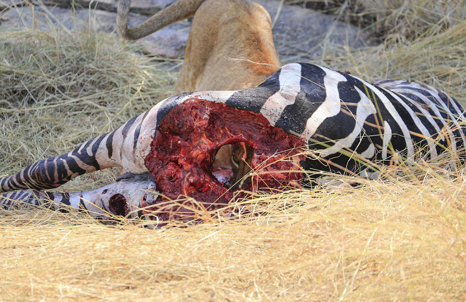 毛骨悚然!非洲母狮藏身动物死尸中(高清组图)