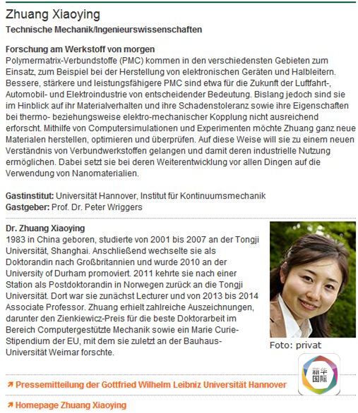 中国美女科学家获颁德国科研大奖
