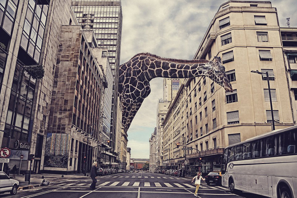 乔斯·玛丽亚·佩雷斯(José María Perez)的作品展示了一只巨大的长颈鹿耸立于阿根廷首都布宜诺斯艾利斯科连特斯大街(Corrientes Avenue)。这张照片经过数码技术的处理。(网页截图)