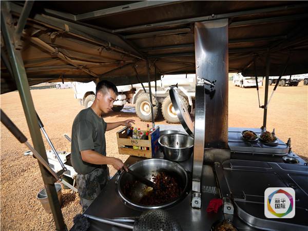 中国维和工兵分队昂松戈分遣队的炊事员使用野战炊事挂车做饭。(新华社记者潘思危摄)