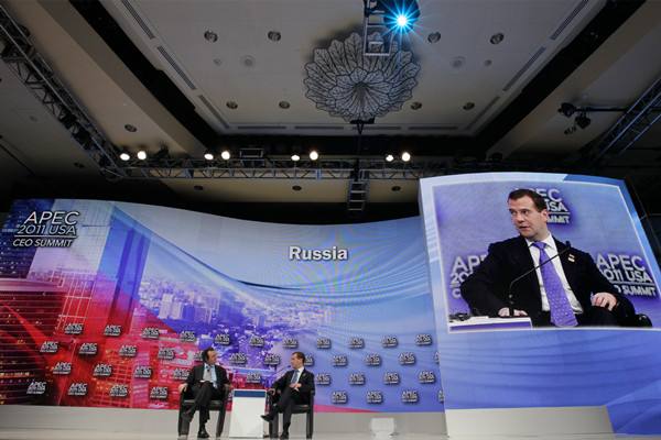 2011年11月13日,俄罗斯总统梅德韦杰夫出席在美国夏威夷州首府檀香山举行的APEC工商领导人峰会。