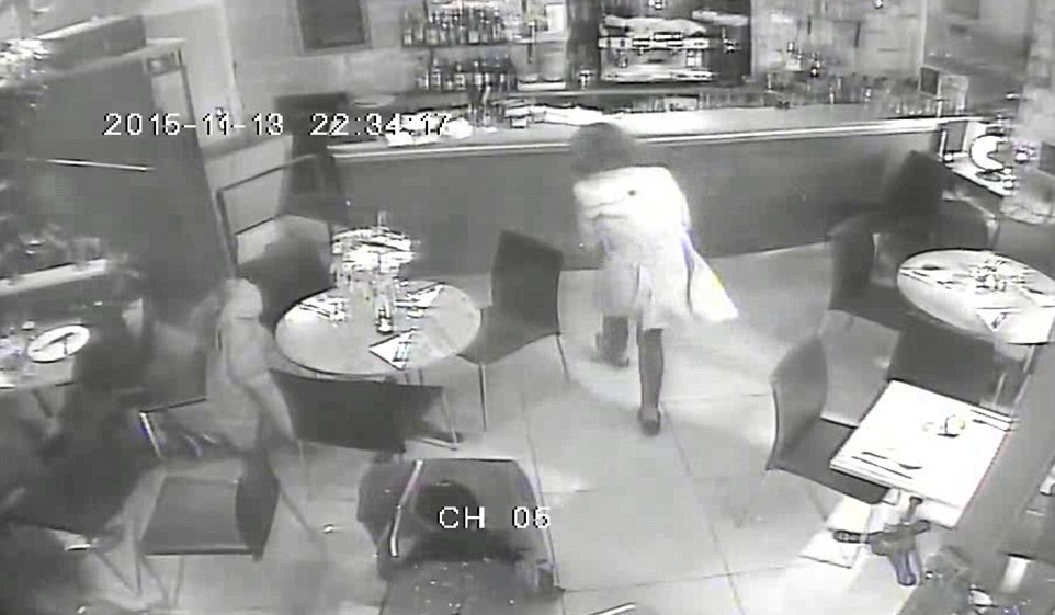 一位腰部中弹的女士跑向吧台后部试图躲避恐怖分子(视频截图)