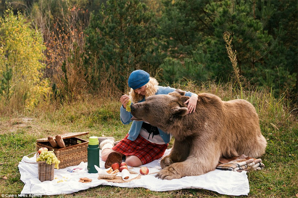 美女与野兽:摄影师拍摄母女与棕熊温馨野餐照。(网站截图)