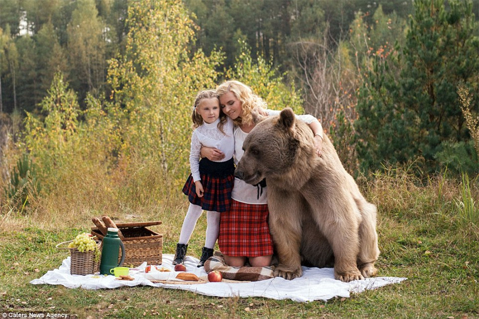 美女与野兽:摄影师拍摄母女与棕熊温馨野餐照。(网站截图)