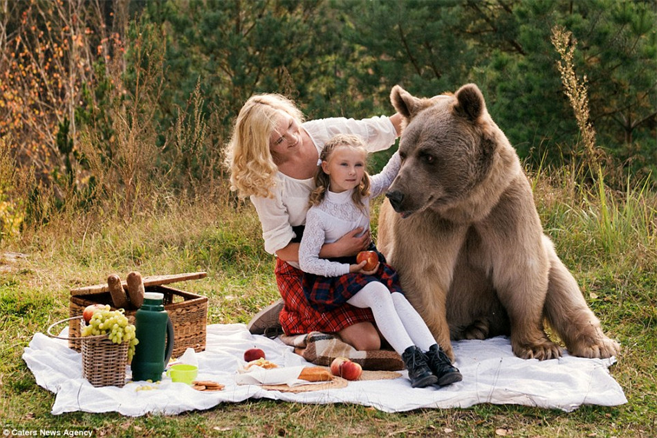美女与野兽:摄影师拍摄母女与棕熊温馨野餐照。(网站截图)
