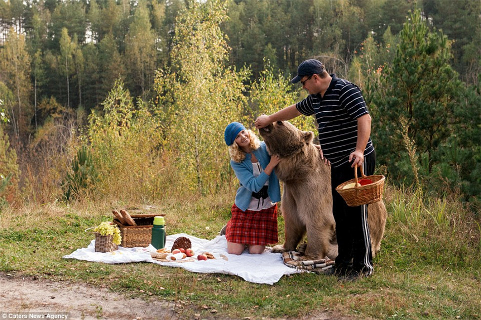 母女与棕熊温馨野餐 棕熊被人类收养长大 (高清)