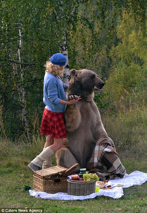 母女与棕熊温馨野餐 棕熊被人类收养长大 (高清)