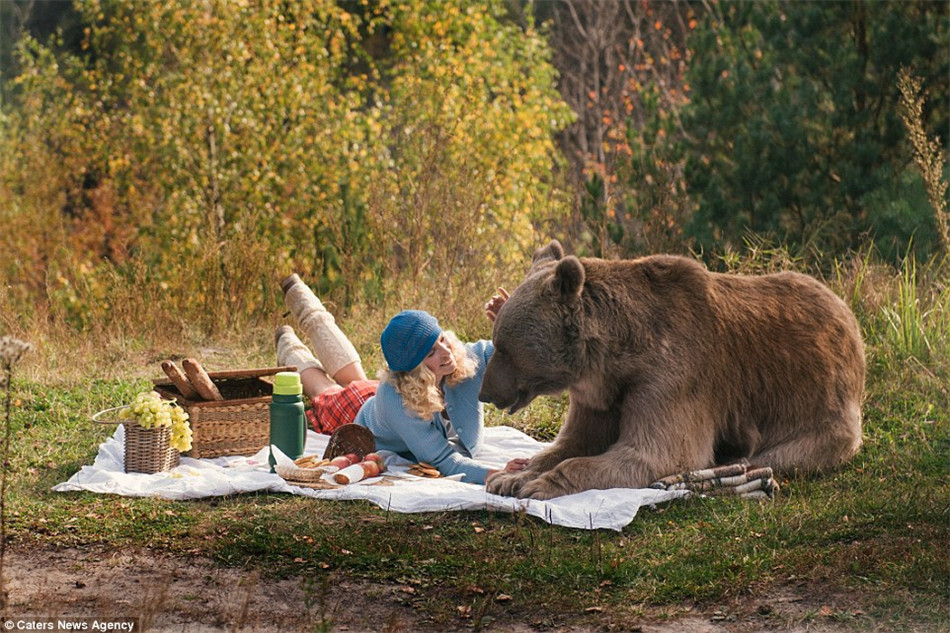 美女与野兽:摄影师拍摄母女与棕熊温馨野餐照。(网站截图)